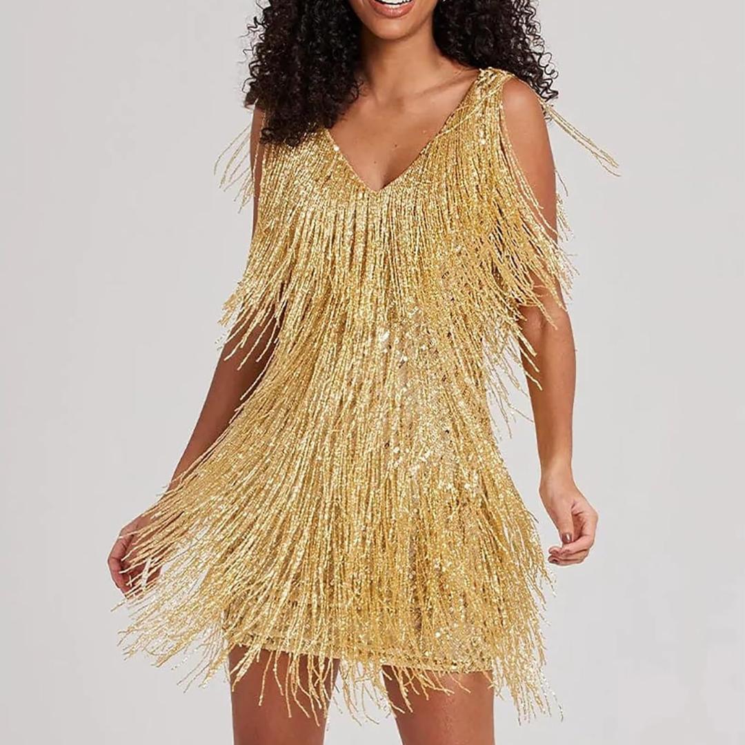 Ärmelloses Minikleid mit V-Ausschnitt und schwungvollen Fransen, ein ausdrucksstarkes Entwurf mit klarer Linienführung. Der tiefe Ausschnitt vorn und hinten unterstreicht die feminine Ausstrahlung, während breite Schulterträger für Stabilität sorgen. Ein Kleid für Cocktailpartys, Abendveranstaltungen und durchtanzte Nächte. In Kombination mit hohen Sandaletten und auffälligen Ohrringen entsteht ein eleganter Aussehen mit besonderer Wirkung. Passend für die Frühlings- und Sommersaison.