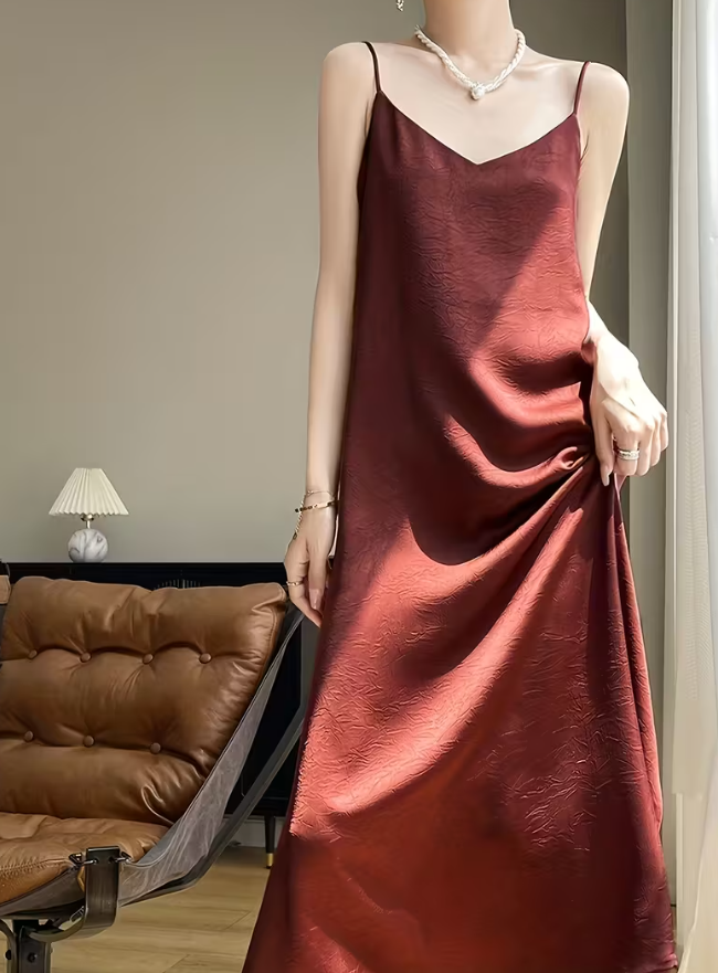 Elegantes Maxikleid mit strukturierter Oberfläche und femininem Schnitt. Der dezente V-Ausschnitt und die dünnen Träger verleihen dem Kleid einen modischen Akzent. Eine gute Wahl für festliche Anlässe wie Sommerhochzeiten oder Abendveranstaltungen. In Kombination mit zarten Sandalen und einer Clutch kreieren Sie einen auffälligen Look. Der Schnitt unterstreicht den fließenden Aussehen des Materials. Zur Pflege wird Handwäsche oder ein Schonwaschgang empfohlen.